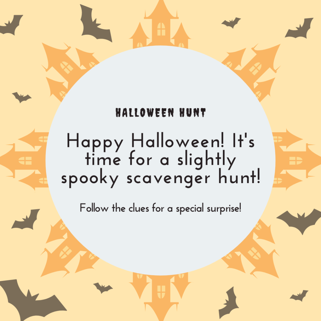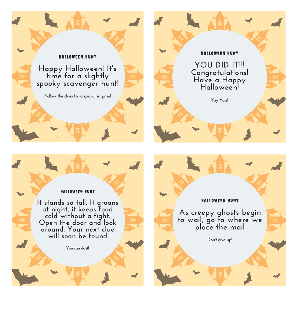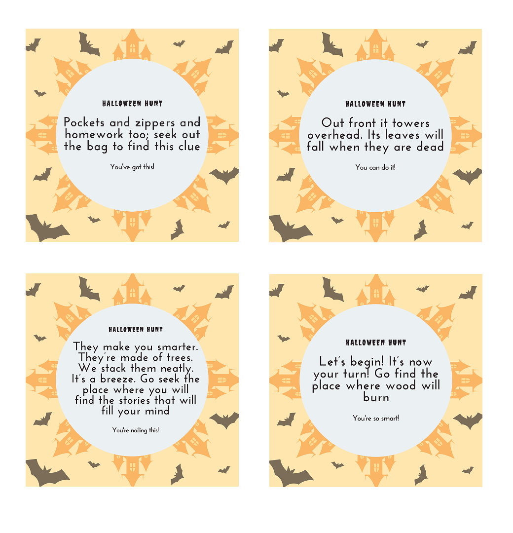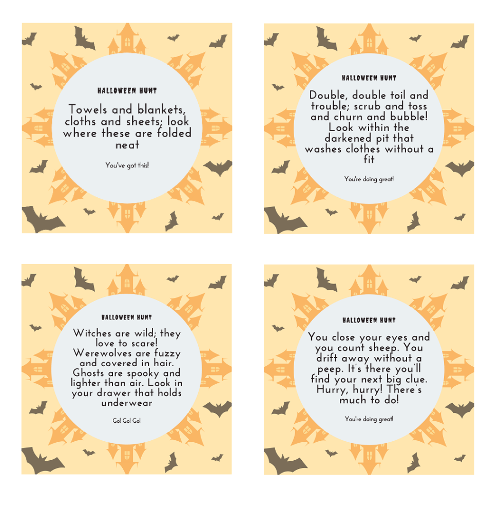 I’ve written 12 clues which lead to various common locations in houses. (fridge, washer, bookshelf, etc). I will print and cut out each of these clues and place them at different locations throughout the house. Each time the kids solve a clue, they will be led to the next one. Because we won’t be trick or treating, I will leave a small treat at each clue. Finally, at the last clue, there will be a little gift for each of them. (For Si, a lego station. For B, a puzzle)