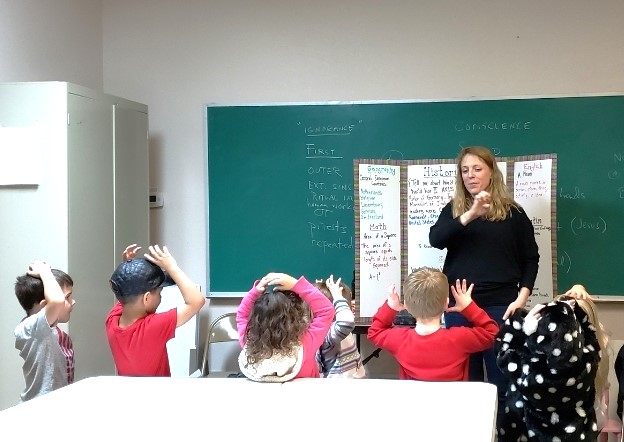 In the afternoon, younger families go back home, but those with children in 4th-6th grade stay for ESSENTIALS. Essentials is an in-depth study of English and Grammar, and further expands Math. A tutor leads the Essentials class and introduces the new material and home work (very similar to the morning session, but geared toward the older elementary and younger middle schoolers in transition). Kids work hard and learn so much in essentials. Half way through the year, they begin a comprehensive research project on a notable person in history. They write a research paper in 3rd person, then re-write it in 1st person. On a given night, they dress like that historical figure and deliver a speech to the community and celebrate their year of diligence.