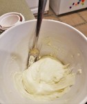 When the cheeses are well mixed, melted, and smooth, add in 1 egg and stir it in too.